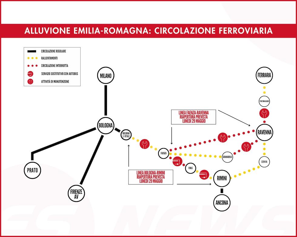Ferrovie dello Stato (FS) ha annunciato che lunedì 29 maggio riaprirà completamente la linea ferroviaria tra Bologna e Rimini, quella che passa anche per Faenza e Forlì, e anche l’ultimo tratto di quella che collega Faenza con Ravenna, tutte danneggiate dall’alluvione che ha interessato la Romagna la settimana scorsa. Saranno dunque ripristinati tutti i collegamenti tra le principali città dell’Emilia-Romagna e tra le regioni adriatiche centrali e meridionali e il Nord Italia: passano per la Romagna i treni che collegano Lecce, Taranto e Bari, in Puglia, a Bologna e Milano.