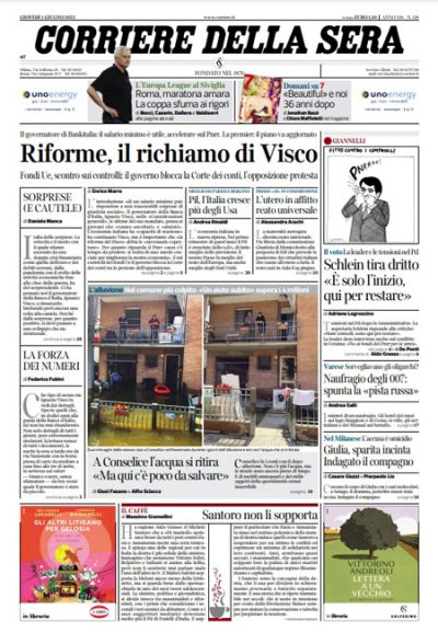 Le notizie principali in apertura sui giornali di oggi sono le considerazioni del governatore della Banca d’Italia Ignazio Visco con le osservazioni sui ritardi nell’attuazione del PNRR e delle riforme da parte del governo, e l’emendamento presentato ieri dalla maggioranza che prevede che i progetti del PNRR non subiscano i controlli della Corte dei Conti. La Stampa e Avvenire titolano invece sulla discussione in commissione Giustizia alla Camera sul disegno di legge sulla gestazione per altri, mentre i giornali sportivi e il Messaggero aprono sulla sconfitta della Roma nella finale di Europa League, vinta dal Siviglia ai rigori.