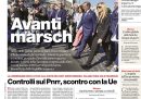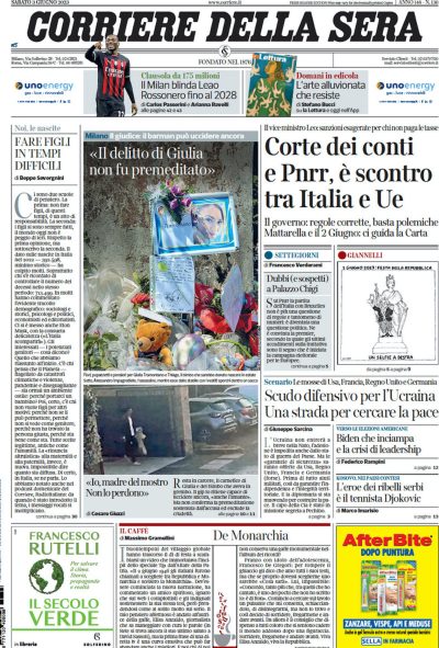 I principali quotidiani oggi aprono sulle perplessità espresse dalla Commissione europea dopo che il governo italiano ha deciso di limitare i controlli della Corte dei conti sul PNRR, altri si concentrano da diversi punti di vista sulle celebrazioni del 2 giugno per la Festa della Repubblica. Su molti giornali sono ancora molto presenti commenti e dettagli sull’omicidio di una giovane donna da parte del suo fidanzato avvenuto a Senago, in provincia di Milano. Per lo sport la notizia del giorno è il rinnovo dell’attaccante portoghese Rafael Leao con il Milan fino al 2028.