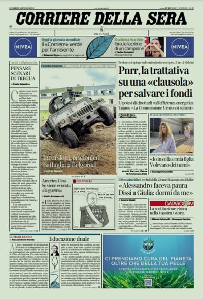 Ci sono notizie diverse in apertura sui giornali di oggi: alcuni si occupano ancora del PNRR e dei ritardi nell’attuazione dei progetti previsti, altri della guerra fra Russia e Ucraina, con i combattimenti vicino alla città russa di Belgorod. La Stampa intervista il ministro dell’Interno Piantedosi sui casi di femminicidio degli ultimi giorni, il Giornale critica i comuni per il numero di multe per infrazioni stradali, il Fatto è contro la produzione e vendita di armi dell’Unione Europea, e Domani critica l’istituzione di una commissione parlamentare d’inchiesta sulla pandemia. I giornali sportivi commentano i risultati dell’ultima giornata di campionato in Serie A, con l’ennesima festa per lo scudetto del Napoli, mentre il Corriere della Sera è stampato su carta verde per la giornata mondiale dell’ambiente.