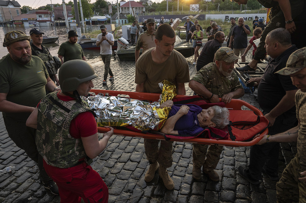 L’evacuazione nelle zone inondate, sulla sponda del Dnipro sotto il controllo ucraino (AP Photo/Evgeniy Maloletka)