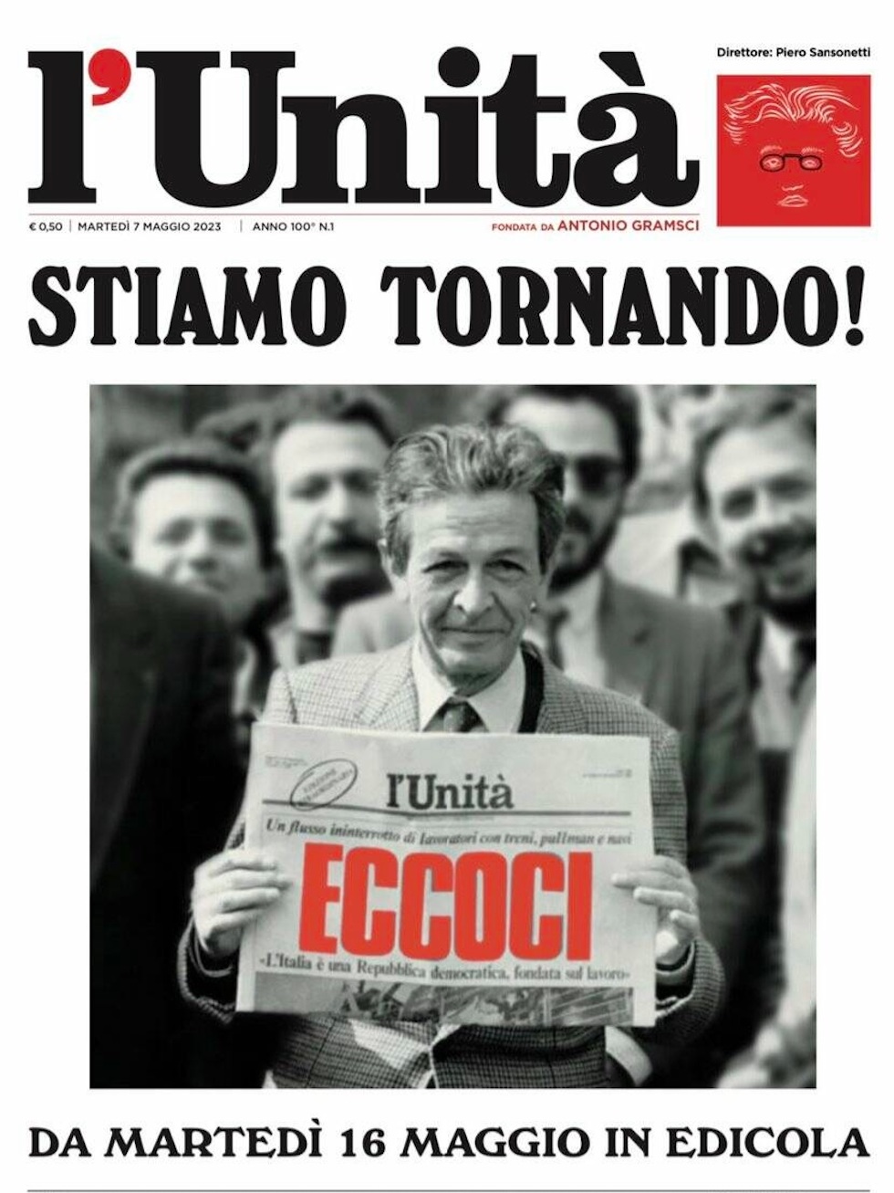 Per promuovere il suo ritorno, l’Unità ha usato in questi giorni una fotografia scattata nel 1984 a Enrico Berlinguer, segretario del Partito Comunista Italiano, alcuni giorni prima della sua morte in seguito a un malore durante un comizio. Nella foto c’è Berlinguer con in mano una copia dell’Unità, allora ancora direttamente legata al suo partito, e con il grande titolo “Eccoci”.