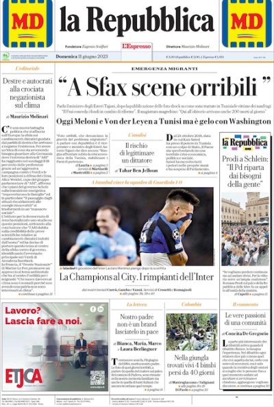 Le prime pagine dei giornali italian si dividono oggi tra varie notizie: alcuni parlano della nuova visita in Tunisia della presidente del Consiglio, Giorgia Meloni, questa volta accompagnata da Ursula von der Leyen, presidente della Commissione Europea. Altri parlano delle evoluzioni della vicenda riguardante i migranti fermati su una nave al largo di Napoli, altri ancora si occupano del Roma Pride di sabato. Molti giornali dedicano inoltre spazio alla storia dei quattro bambini trovati nella giungla colombiana 40 giorni dopo un incidente aereo. La principale notizia di sport riguarda invece la finale di Champions League vinta dal Manchester City contro l’Inter.