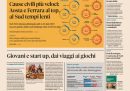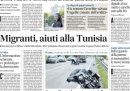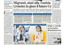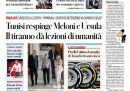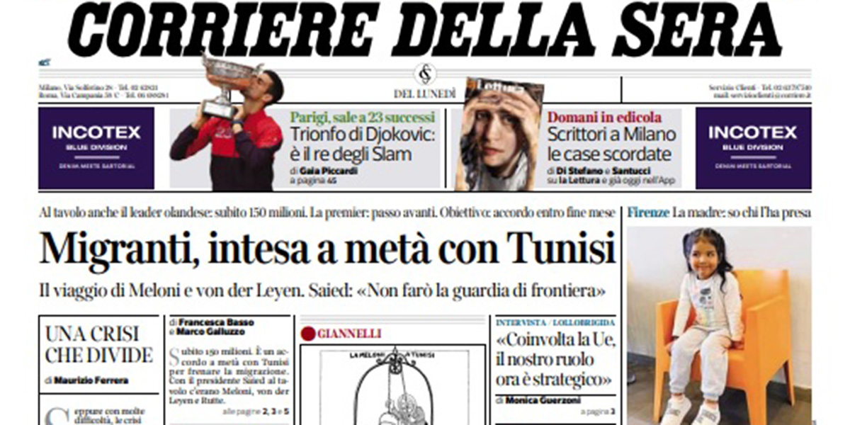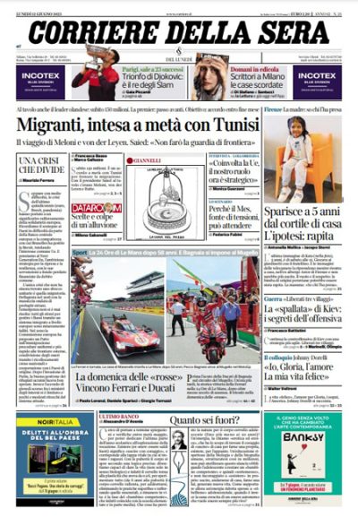 La notizia principale in apertura sui giornali di oggi è la visita in Tunisia della presidente della Commissione europea Ursula von der Leyen e della presidente del Consiglio Giorgia Meloni: il giudizio dei vari giornali sui risultati del loro incontro con il presidente tunisino Saied è diverso fra chi vede il bicchiere mezzo vuoto o mezzo pieno, ma per il momento sulla gestione dei migranti non sembra ci sia nessun accordo in vista. Domani apre invece sulle violenze della polizia, associando a quelle nella questura di Verona il caso Cucchi e quello del carcere di Santa Maria Capua Vetere, il Giornale critica le amministrazioni di centrosinistra di Milano e Roma, mentre sui giornali sportivi domina il colore rosso, con le vittorie della Ferrari nella 24 ore di Le Mans e della Ducati nella MotoGP in Mugello.
