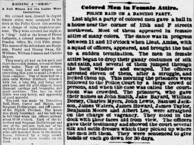 Ben presto queste feste attirarono l’attenzione della polizia e cominciarono le retate. Nel gennaio del 1887 il Washington Critic raccontò come gli agenti che fecero irruzione in uno di questi balli furono sorpresi nel trovare sei uomini neri «vestiti con eleganti abiti femminili», con strascichi, corsetti e collant. L’aprile successivo l’Evening Star diede notizia di un’altra retata contro uomini con «sgargianti costumi di raso e seta».
