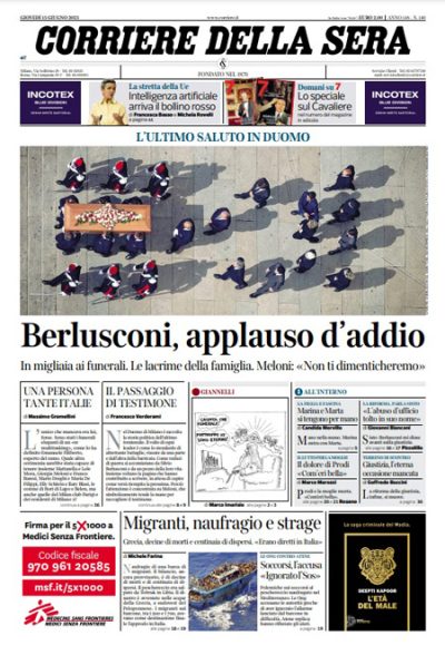 Su tutti i giornali di oggi la notizia di apertura è il funerale di Silvio Berlusconi, che si è svolto ieri pomeriggio nel Duomo di Milano alla presenza delle principali cariche dello Stato. Fanno eccezione Repubblica, il Manifesto e l’Unità, che aprono invece sul naufragio di un barcone che trasportava persone migranti al largo del Peloponneso, in Grecia, nel quale secondo le prime notizie sarebbero morte almeno 78 persone, ma si teme che il numero delle vittime possa essere molto più alto.