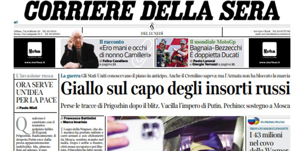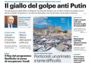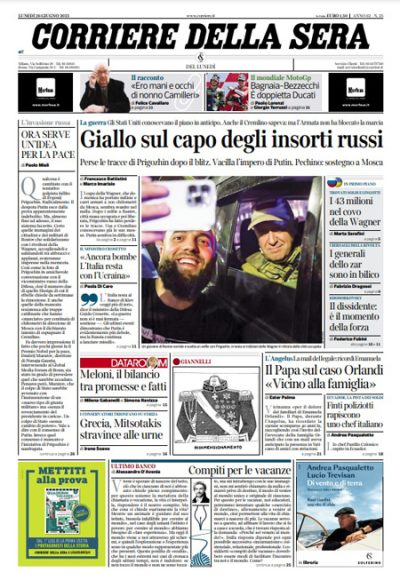 È ancora la situazione in Russia dopo la rivolta del gruppo Wagner, rientrata con la mediazione del presidente bielorusso Lukashenko, la notizia di apertura su quasi tutti i giornali di oggi: i titoli principali riguardano il destino del capo del gruppo Wagner Prigozhin, di cui sembrano essersi perse le tracce dopo la sua partenza da Rostov, i rapporti di potere in Russia, con il regime del presidente Putin indebolito dall’azione, e le conseguenze sulla situazione in Ucraina. Il Fatto si occupa invece delle critiche alla ministra del Turismo Santanché, dopo l’inchiesta della trasmissione Report della settimana scorsa sulla gestione delle sue aziende, mentre il Tempo apre sul probabile rinvio della discussione parlamentare sul Meccanismo europeo di stabilità.