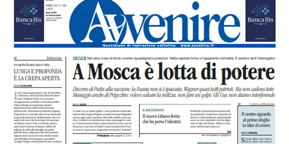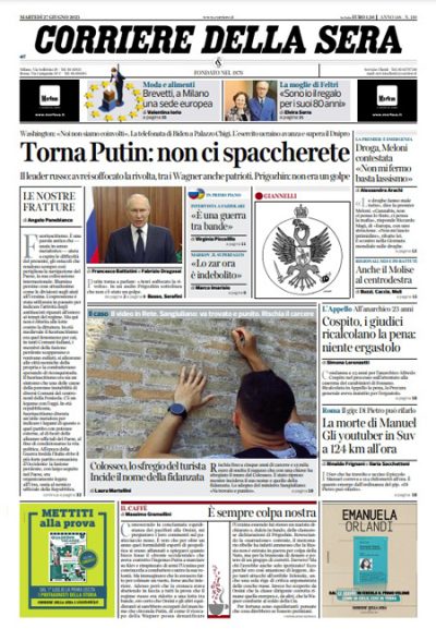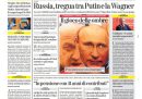 La maggior parte dei giornali di oggi si occupa in apertura ancora della situazione in Russia dopo la rivolta del gruppo Wagner di sabato scorso: ieri è ricomparso il presidente Putin che in un discorso al paese ha invitato i membri di Wagner a unirsi all’esercito o ad andare in Bielorussia, mentre il capo di Wagner Prigozhin ha detto che non aveva intenzione di fare un colpo di stato ma solo di difendere i suoi soldati. Il Messaggero, Domani, il Riformista e il Tempo aprono invece sulle elezioni regionali in Molise, dove ha vinto il candidato della destra Roberti, il Fatto segue le notizie sulla ministra del Turismo Santanchè e sulla gestione delle sue aziende, e Libero titola sugli aumenti delle pensioni da luglio.