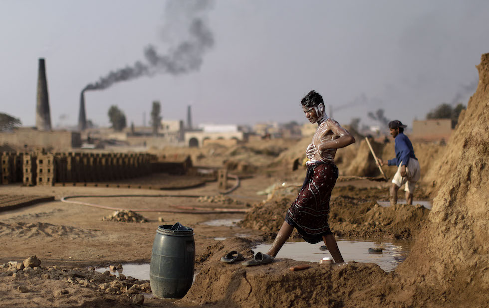 Un ragazzo si lava vicino a una fabbrica di mattoni a Islamabad, in Pakistan, il 27 dicembre 2011 (AP Photo/Muhammed Muheisen)