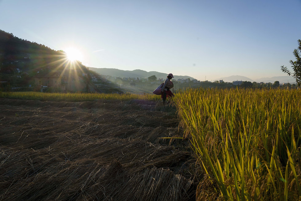 Un contadino in una risaia a Bhaktapur, in Nepal, il 17 ottobre 2022 (AP Photo/Niranjan Shrestha)