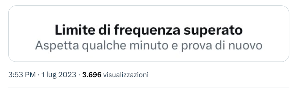 Musk non ha dato dettagli su chi stesse effettuando lo scraping di dati su Twitter né da quanto tempo persistesse il problema. Non ha detto nemmeno quando i limiti ai contenuti visibili per ogni utente verranno rimossi. Per ora a chiunque raggiunge il limite di contenuti relativo al proprio profilo compare un messaggio come questo: