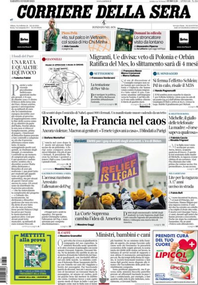 Sono due le notizie principali sulle quali aprono i giornali di oggi: la conclusione del Consiglio europeo senza un accordo sulle modifiche alle regole per la gestione dei migranti nei paesi dell’Unione Europea, per l’opposizione di Polonia e Ungheria alla norma che prevede la ridistribuzione obbligatoria fra i vari paesi, e gli scontri delle ultime notti in Francia dopo l’uccisione del diciassettenne Nahel M. da parte di un poliziotto. Il Fatto si occupa invece dell’inchiesta sulle società della ministra del Turismo Santanchè, Libero titola sull’occupazione in Italia, e i giornali sportivi aprono sul passaggio dal Napoli alla Juventus del direttore sportivo Giuntoli.