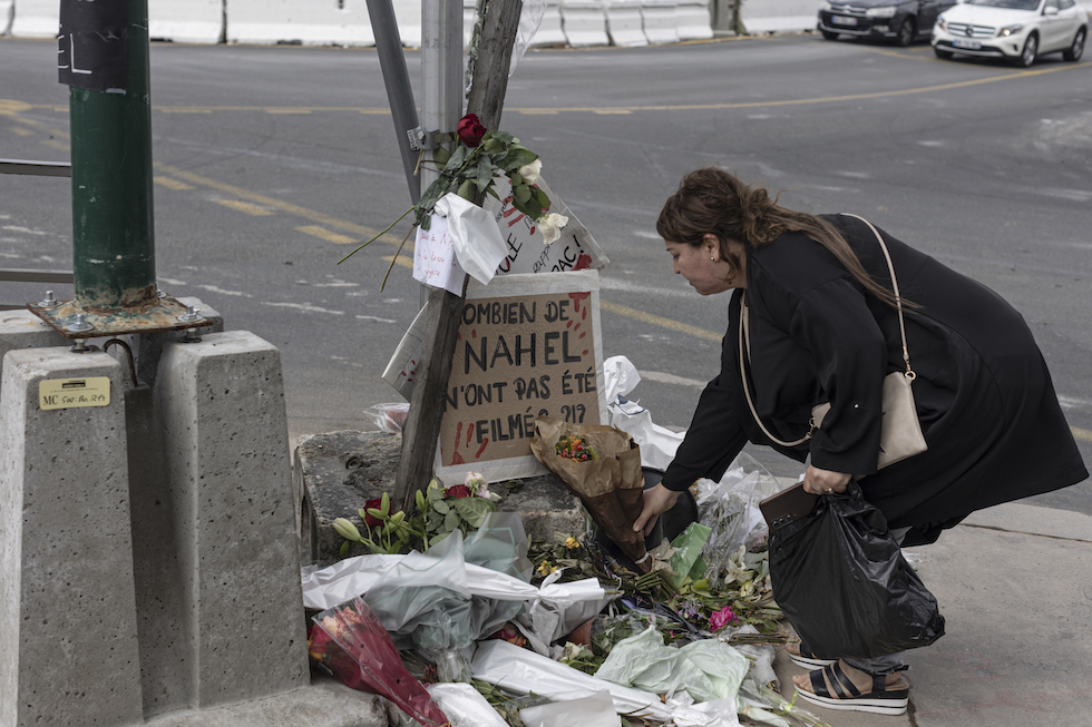 Una donna appoggia alcuni fiori nel punto in cui è stato ucciso Nahel M. (Sam Tarling/Getty Images)