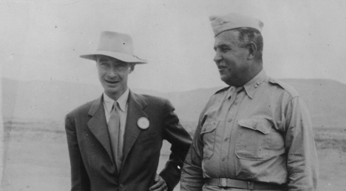 Julius Robert Oppenheimer a sinistra e Leslie Groves a Los Alamos, New Mexico (Keystone/Getty Images)