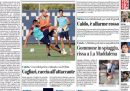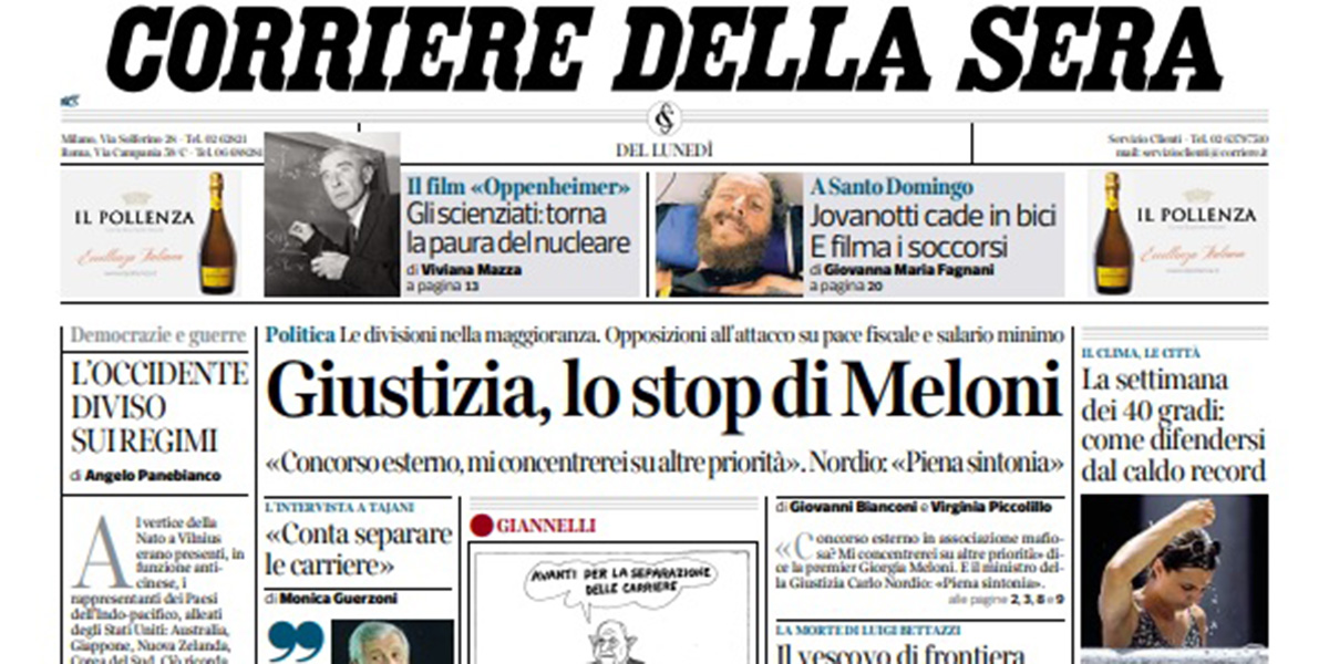 Le due notizie principali su cui aprono i giornali di oggi sono le parole sulla riforma della giustizia della presidente del Consiglio Meloni, che ha detto che l’abolizione del reato di concorso esterno in associazione mafiosa sulla quale si è molto discusso negli ultimi giorni non è una delle priorità da affrontare, e l’accordo firmato ieri fra Unione Europea e Tunisia che prevede aiuti economici alla Tunisia e l’impegno a limitare le partenze di migranti verso l’Europa. Repubblica critica l’uso eccessivo dei condoni da parte del governo, il Giornale ospita un articolo di Marina Berlusconi sullo stato della giustizia in Italia, e i giornali sportivi si dividono fra le notizie sul calciomercato e la vittoria di Alcaraz nel torneo di tennis di Wimbledon.