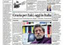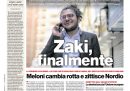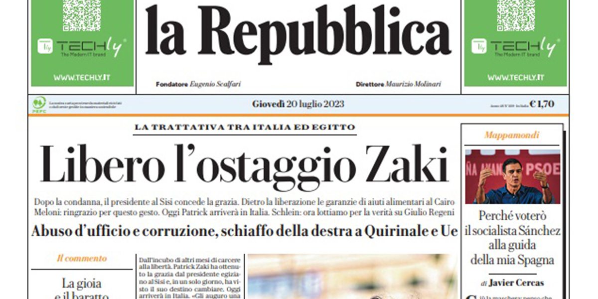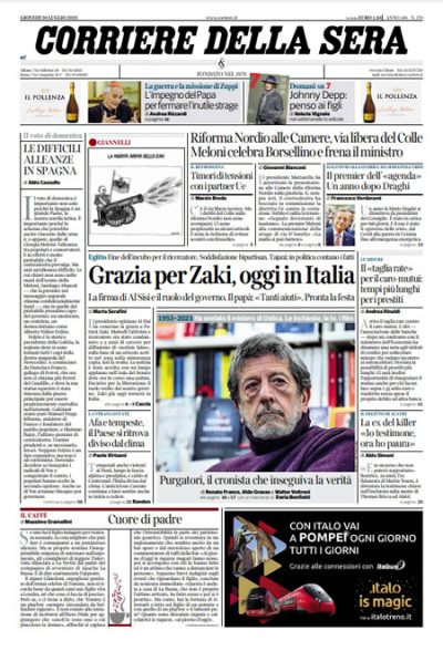 La maggior parte dei giornali di oggi si occupa in apertura della grazia concessa dal presidente egiziano Abdel Fattah al Sisi a Patrick Zaki, dopo la condanna a tre anni di carcere che era stata decisa martedì, e dell’annuncio della presidente del Consiglio Meloni del suo ritorno in Italia previsto per oggi. Altri giornali aprono invece sui temi legati alla giustizia, con la firma del presidente della Repubblica Mattarella sul disegno di legge di riforma della giustizia, le parole di Meloni nel giorno dell’anniversario della morte di Paolo Borsellino che sono sembrate un richiamo al ministro della Giustizia Nordio, e la bocciatura alla Camera da parte della maggioranza della direttiva europea sulla corruzione, mentre Avvenire segue le trattative diplomatiche per la guerra fra Russia e Ucraina.