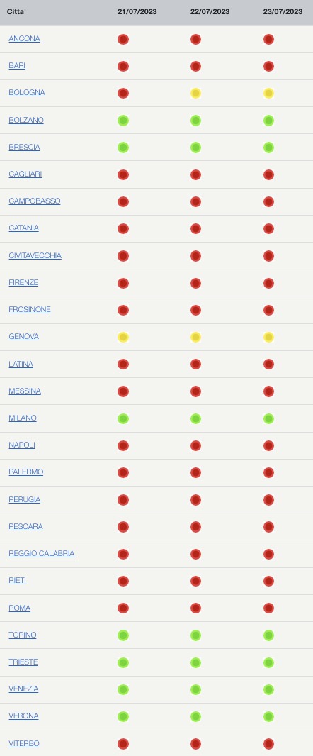 Nell’ultimo bollettino sulle ondate di calore, il ministero della Salute ha previsto per oggi il più alto livello di rischio per il caldo in 19 città, comprese Roma e Firenze, e in 18 città per domenica 23 luglio. Il livello di rischio più alto, che corrisponde al 3 ed è informalmente chiamato “bollino rosso”, segnala quelle condizioni meteorologiche che possono avere effetti negativi per la salute non solo per le persone più vulnerabili, come anziani, bambini molto piccoli e malati cronici, ma anche per le persone sane. Come buona parte dell’Europa, l’Italia è interessata da diversi giorni da temperature massime ampiamente sopra la media stagionale, che secondo le previsioni proseguiranno fino alla metà della prossima settimana.