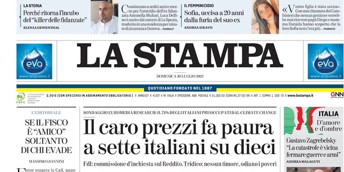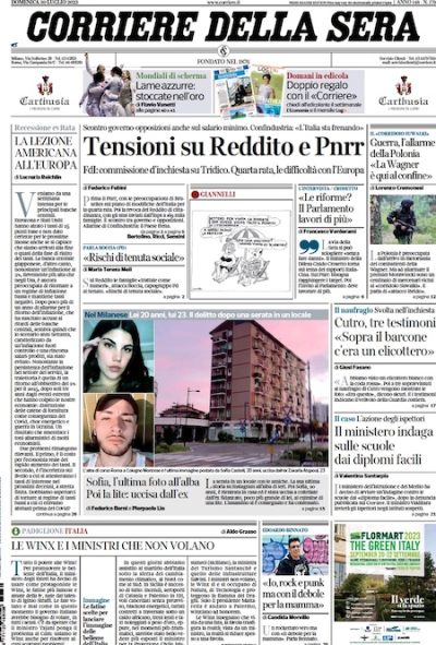 In mancanza di grosse notizie, i quotidiani di oggi aprono con storie molto diverse tra loro: il Corriere titola sulle polemiche per la sospensione del reddito di cittadinanza, Repubblica sul cambiamento climatico, la Stampa sull’inflazione. Anche altri quotidiani nazionali dedicano la prima pagina all’aumento dei prezzi, in particolare all’aumento del costo della benzina in un momento in cui moltissimi italiani partono per le ferie. I quotidiani sportivi si concentrano sulle amichevoli estive delle squadre di calcio italiane e sulle trattative per portare il centrocampista dell’Udinese Lazar Samardzic all’Inter.