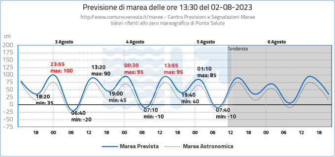 Dal 1872 (anno in cui sono iniziate le misurazioni) condizioni simili a quelle registrate in questi primi giorni di agosto si erano verificate soltanto due volte, tutte di recente: nel 1995 e nel 2020. Già a fine luglio del 2019, tuttavia, in laguna era stato registrato un valore massimo di 97 centimetri definito «straordinario», visto che soltanto nel 2014, nel 2002 e nel 1987 si erano verificate maree estive di almeno 97 centimetri. Il direttore del Centro maree aveva spiegato: «Con un livello medio del mare così alto, basta una perturbazione per ritrovarsi con un evento di marea significativo anche d’estate. E accadrà sempre più spesso».