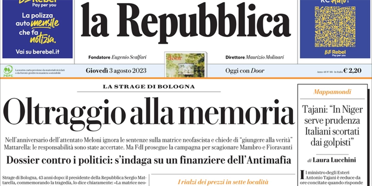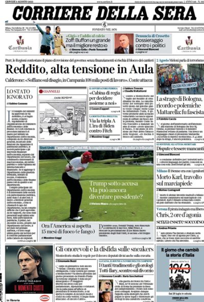 L’apertura dei giornali di oggi è dedicata a notizie diverse: alcuni si occupano delle celebrazioni per l’anniversario della strage alla stazione di Bologna e delle polemiche sulle parole della presidente del Consiglio Meloni che non ha citato la matrice fascista dell’attentato, altri titolano sulla sospensione del reddito di cittadinanza per molte famiglie e sulla discussione in parlamento sul tema. Il Resto del Carlino e l’Unità riportano le preoccupazioni dei presidenti di regione per le modifiche al PNRR, Libero apre sull’intervento alla Camera di Fassino che ha mostrato la sua busta paga contestando il fatto che i parlamentari abbiano stipendi troppo elevati, e i giornali sportivi seguono le notizie sul calciomercato.