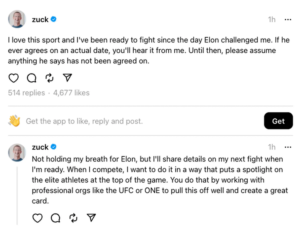 Il giorno dopo tuttavia Zuckerberg ha ribattuto sul social network Threads che l’incontro non è ancora stato concordato, e ha detto che le dichiarazioni di Musk non hanno fondamento: «Quando [Musk] accetterà per davvero una data, lo saprete da me», ha scritto.