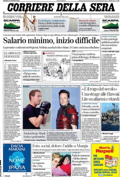 Alla morte di Michela Murgia è dedicato molto spazio anche sulle prime pagine di oggi: nel pomeriggio si terranno i suoi funerali. Quasi tutti i quotidiani nazionali aprono con gli scarsi risultati dell’incontro di ieri tra governo e opposizioni sul salario minimo; su alcune prime pagine si fa riferimento al caso del carcere delle Vallette di Torino, dove ieri sono morte due donne detenute a distanza di poche ore l’una dall’altra. Benché manchino informazioni definitive e concrete hanno ottenuto una certa attenzione anche gli ultimi aggiornamenti sul “combattimento” tra Elon Musk e Mark Zuckerberg, che dovrebbe tenersi in Italia e avere come tema l’antica Roma.