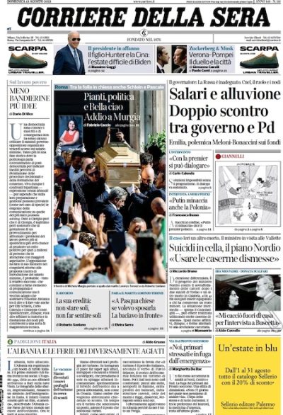 Sulle prime pagine di oggi si dedica spazio al funerale di Michela Murgia, che si è tenuto sabato pomeriggio alla Chiesa degli Artisti di Roma, ma si parla anche di carcere, per via della visita del ministro della Giustizia Carlo Nordio al carcere delle Vallette di Torino: la storia della morte delle due donne detenute nella struttura torinese oggi è l’apertura di diversi quotidiani. Si parla poi ancora di salario minimo e dell’imminente ponte di Ferragosto.