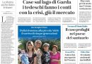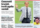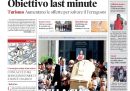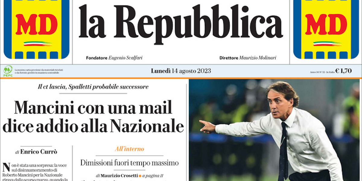 La maggior parte dei quotidiani di oggi mette in grande evidenza in prima pagina l’annuncio delle dimissioni di Roberto Mancini da allenatore della Nazionale di calcio maschile, arrivato domenica a sorpresa: molti, e soprattutto i giornali sportivi, fanno il nome di Luciano Spalletti come suo possibile successore, non si sa con quanta concretezza. Per la politica si parla ancora molto di cosa intende fare il ministro della Giustizia Carlo Nordio per migliorare la situazione di sovraffollamento delle carceri, dopo due suicidi avvenuti venerdì in poche ore nel carcere di Torino. La presidente del Consiglio Giorgia Meloni ha dato un’intervista “congiunta” a Corriere della Sera, Repubblica e La Stampa, i tre principali giornali generalisti: commenta molti temi di attualità, su tutti la tassa decisa dal governo sui cosiddetti “extraprofitti” delle banche. Ancora per lo sport, solo alcuni quotidiani hanno fatto in tempo a inserire in prima pagina la vittoria del tennista italiano Jannik Sinner nel torneo di Toronto, arrivata in tarda serata.