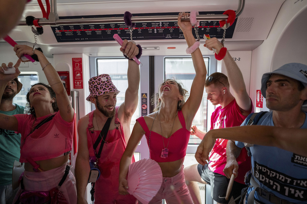 Manifestanti che protestano contro la chiusura della nuova linea del tram durante lo Shabbat (AP Photo/Ohad Zwigenberg)