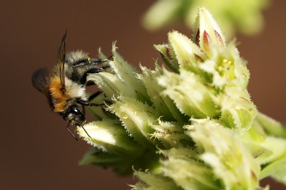 Un’ape selvatica raccoglie il polline da un fiore in un campo vicino a Wernigerode, in Germania, il 18 giugno 2022 (AP Photo/Matthias Schrader)
