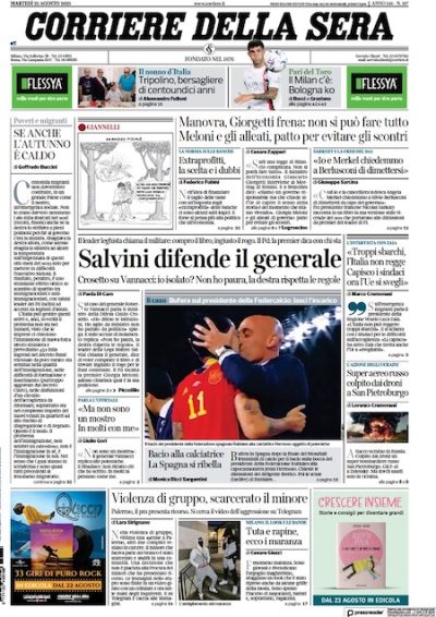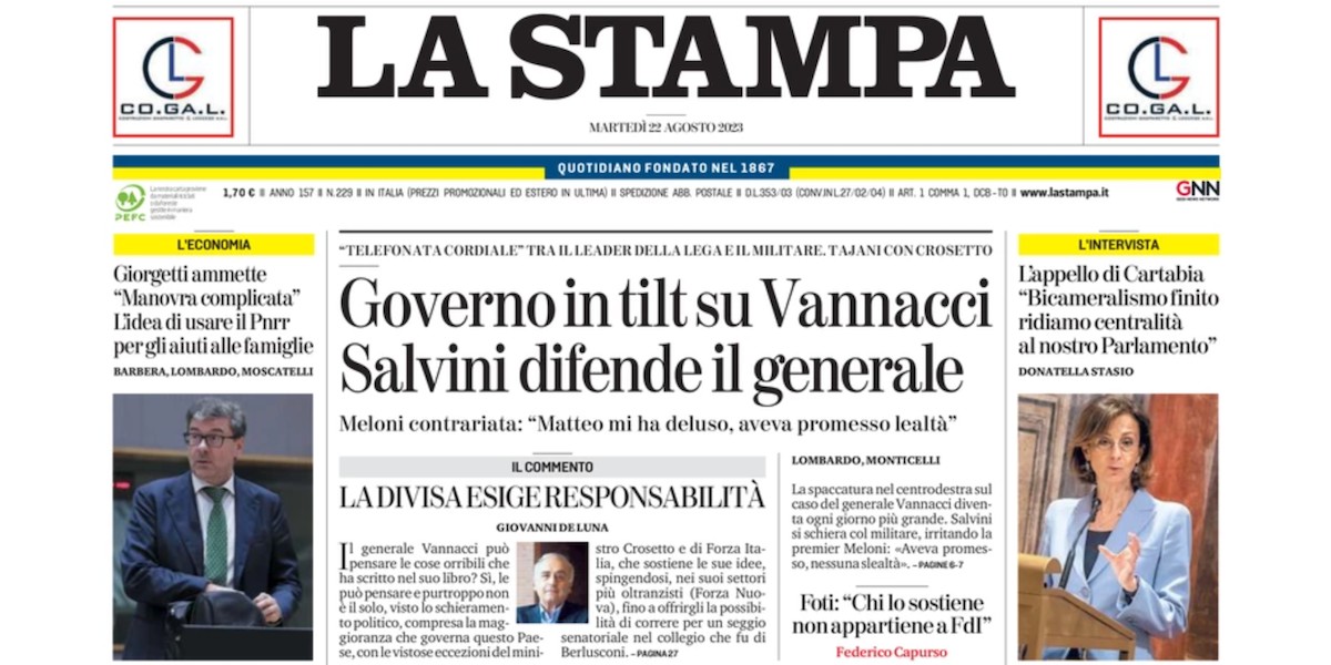 Buona parte delle prime pagine di oggi è dedicata alle divisioni nella destra sul caso del libro omofobo scritto dal generale destituito Roberto Vannacci, che trova spazio sia sui principali quotidiani nazionali che sulla stampa locale. Avvenire, Il Manifesto e altri aprono con le discussioni sulla prossima legge di bilancio, mentre Il Tempo dedica la prima pagina al tema della castrazione chimica per affrontare la questione della violenza maschile sulle donne. Tra le altre cose, i prezzi del carburante, la questione dei migranti, l’incontro di Comunione e Liberazione in corso a Rimini e il caldo anomalo che sta riguardando anche le Alpi.