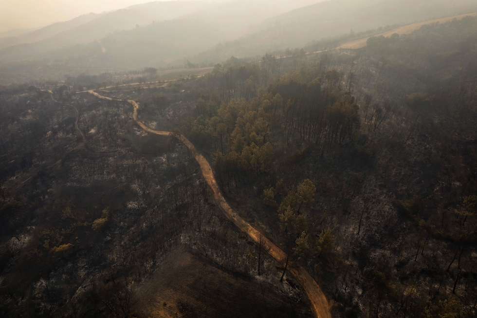 Alberi bruciati nei dintorni di Kirkis, vicino ad Alessandropoli, il 23 agosto 2023 (AP Photo/Achilleas Chiras, LaPresse)