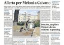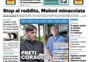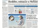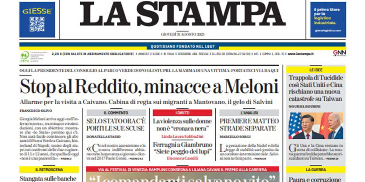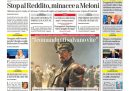 La maggior parte dei giornali di oggi si occupa in apertura delle minacce ricevute dalla presidente del Consiglio Meloni, in occasione della sua visita a Caivano prevista per oggi, per il taglio del reddito di cittadinanza. Il Corriere della Sera apre sull’andamento della guerra fra Russia e Ucraina, Repubblica titola sul film Comandante che ha aperto la Mostra del cinema di Venezia, il Fatto è contro la riforma della forma di governo a cui starebbe lavorando la maggioranza, mentre la Verità torna a un suo cavallo di battaglia, la critica dei vaccini contro il coronavirus.