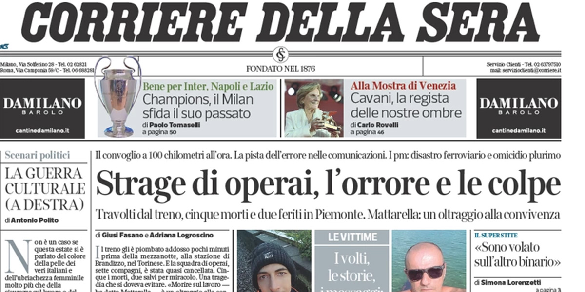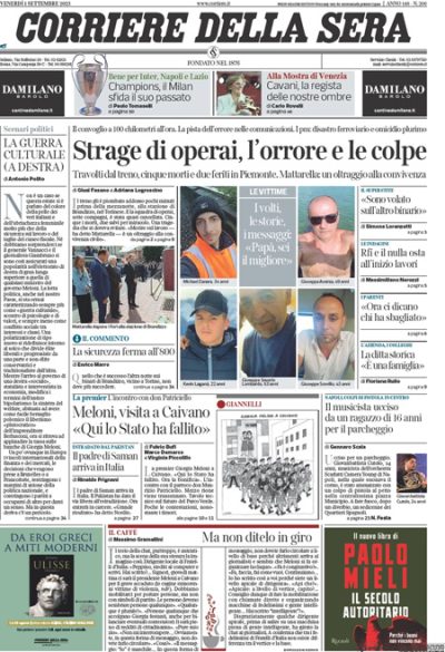 La maggior parte dei giornali di oggi si occupa in apertura della morte di cinque operai travolti da un treno sulla linea ferroviaria a Brandizzo, vicino a Torino, sulla quale stavano lavorando per la sostituzione di un tratto di binario. Qualche quotidiano apre invece sulla visita della presidente del Consiglio Meloni a Caivano, vicino a Napoli, mentre il Sole 24 Ore titola sui dati sull’occupazione di luglio e sull’inflazione di agosto, la Verità commenta i dati di vendita del libro del generale Vannacci, e Libero si occupa della spesa per lo stato per il superbonus edilizio al 110%. I giornali sportivi commentano i risultati del sorteggio dei gironi di Champions League, abbastanza favorevoli per Inter, Lazio e Napoli, meno per il Milan.
