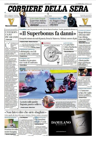 Sulla maggior parte di giornali di oggi l’apertura è dedicata al forum Ambrosetti a Cernobbio, con l’intervento del ministro dell’Economia Giorgetti che ha criticato nuovamente il superbonus edilizio al 110% per i suoi effetti sui conti pubblici, i giudizi sulla proposta del centrosinistra sul salario minimo e sull’attività del governo Meloni. Il Fatto critica il ministro della Giustizia Nordio per la lentezza dei processi, la Verità torna sulle parole dell’ex presidente del Consiglio Amato sulla strage di Ustica, e Libero titola sulla proposta del ministro delle Infrastrutture Salvini di riaprire all’utilizzo del nucleare. I giornali sportivi aprono sui risultati della domenica in Serie A, con le vittorie di Inter e Juventus.