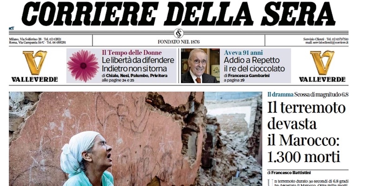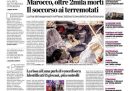 La maggior parte dei giornali di oggi ha in apertura gli enormi danni causati dal gravissimo terremoto avvenuto in Marocco nella notte tra venerdì e sabato, che finora ha provocato la morte di almeno 2mila persone. Si parla molto anche del G20 iniziato sabato a New Delhi, in India: secondo Repubblica, tra le altre cose, la presidente del Consiglio italiana Giorgia Meloni avrebbe parlato con il primo ministro cinese Li Qiang dell’intenzione dell’Italia di uscire dalla Belt and Road Initiative (anche chiamata “Nuova Via della Seta”), il grande progetto economico e politico promosso dalla Cina che prevede investimenti su infrastrutture in tutto il mondo. I giornali sportivi si occupano invece soprattutto del pareggio della Nazionale maschile di calcio nella partita di qualificazione agli Europei contro la Macedonia del Nord, un risultato che complica molto le possibilità dell’Italia.