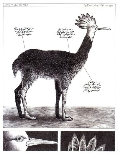 L’Upupa Quadrupede (numero 608) è nata, invece, in un modo più classico, e cioè come animale singolo, portatore di una stranezza unica e sorprendente. Ho subito visto che tale singolarità meritava di essere approfondita in un’opera a parte, che sapesse spiegare – non solo con disegni ma in modo completo – l’anatomia ibrida della bestia (compreso lo scheletro e parte della muscolatura), le sue preferenze alimentari, la forma specialissima della lingua e la sua capacità di mirare alle prede perfino da dietro un ostacolo. Non tutti gli animali immaginari, però, vivono una vicenda così coerente o scientificamente istruttiva. Il ritrovamento di un Quaderno del Guardiano, per esempio, ci fa conoscere tutti i commenti negativi, spesso addirittura aggressivi, che – per via del suo odore insopportabile – il pubblico rivolse al Pochezampe (numero 478) per tutto il tempo in cui questi restò tristemente custodito nello zoo di Lumbard-Truzzen durante i primi anni del secolo scorso.