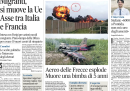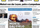Gran parte dei quotidiani di oggi apre con lo schianto di un aereo delle frecce tricolori avvenuto sabato pomeriggio a Torino o con l’aumento degli arrivi di migranti a Lampedusa, dove domenica andranno in visita Giorgia Meloni e Ursula von der Leyen. I giornali sportivi parlano invece delle larghe vittorie dell’Inter sul Milan e della Juventus contro la Lazio.