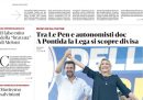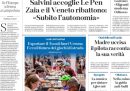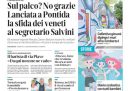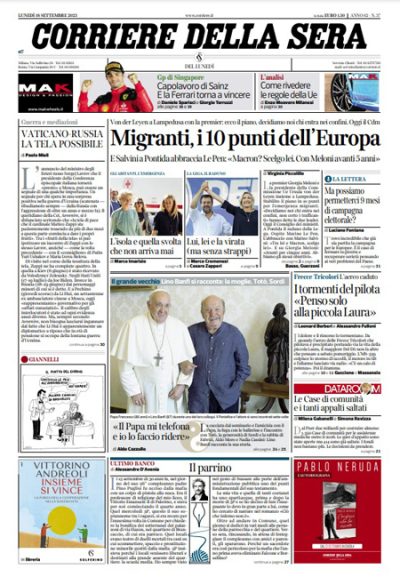 Le due notizie principali in apertura sui giornali di oggi sono la visita a Lampedusa della presidente del Consiglio Meloni e della presidente della Commissione europea von der Leyen, che ha annunciato un nuovo piano per la gestione degli arrivi dei migranti, e il raduno organizzato dalla Lega a Pontida con la partecipazione accanto al segretario Salvini della leader del partito di destra francese Rassemblement National Marine Le Pen. I giornali sportivi commentano la vittoria della Ferrari di Sainz nel gran premio di Formula 1 di Singapore.