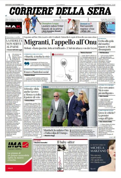 Sono sempre le notizie sulla gestione degli arrivi in Italia delle persone migranti a occupare l’apertura dei giornali di oggi: i titoli principali riguardano il discorso della presidente del Consiglio Meloni all’assemblea generale delle Nazioni Unite, nel quale ha chiesto collaborazione per contrastare gli arrivi, le critiche del leader della Lega Salvini alla presidente della Commissione europea von der Leyen, e l’opposizione di alcune regioni al piano del governo per costruire nuovi centri per il rimpatrio sui loro territori. Il Fatto si occupa dei guai delle aziende della ministra del Turismo Santanchè, e i giornali sportivi commentano i risultati delle squadre italiane in Champions League, con la vittoria del Napoli e il pareggio dell’Inter.