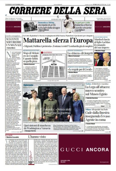 Per la maggior parte dei giornali di oggi è sempre la gestione degli arrivi dei migranti in Italia la notizia di apertura: i titoli riguardano le discussioni con le regioni per l’apertura di nuovi centri per il rimpatrio, l’intervento del presidente della Repubblica Mattarella che ha proposto di modificare gli accordi di Dublino relativi alle procedure di gestione dei richiedenti asilo, e la decisione della Corte di giustizia europea che ha bocciato i respingimenti operati dalla Francia. Repubblica titola invece sulla crescita del debito pubblico, la Stampa si occupa delle critiche della Lega al direttore del Museo egizio di Torino, il Manifesto e il Fatto aprono sull’incontro fra il presidente ucraino Zelensky e quello degli Stati Uniti Biden, e il Giornale fa un bilancio del primo anno del governo Meloni.