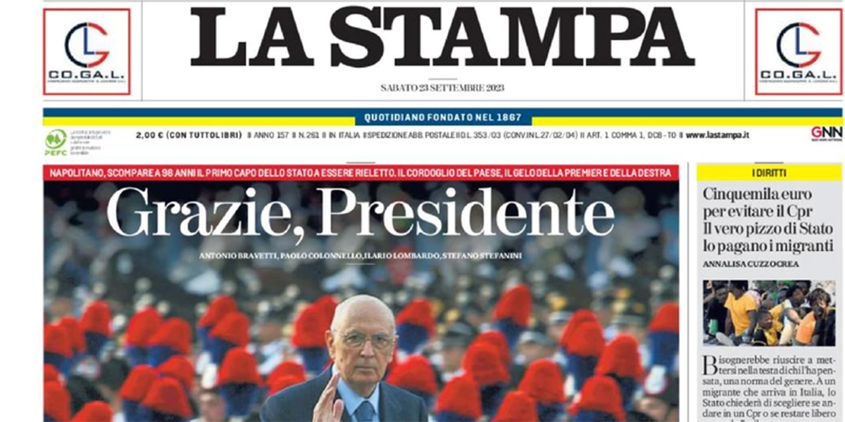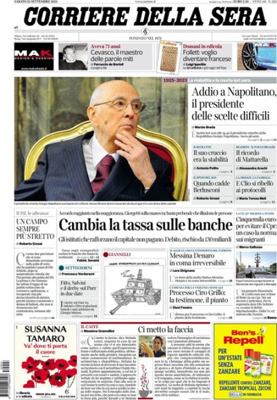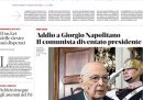 La morte dell’ex presidente della Repubblica Giorgio Napolitano è la notizia principale che occupa le prime pagine dei giornali di oggi, ma il tema della gestione degli arrivi dei migranti continua a prendere molto spazio, con la norma prevista dal governo che prevede che i migranti possano evitare di essere rinchiusi nei centri per il rimpatrio pagando una cauzione di 5mila euro e i nuovi finanziamenti decisi dalla Germania per le attività delle organizzazioni non governative che operano nel Mediterraneo.