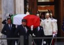 Il corteo funebre era partito intorno alle 11:30 da Palazzo Madama, dove nelle giornate di domenica e lunedì era stata allestita la camera ardente, era passato per alcune delle principali vie del centro di Roma e arrivato in pochi minuti a Montecitorio. L’arrivo del feretro è stato accolto con l’inno di Mameli. Per la giornata di martedì è stato anche dichiarato il lutto nazionale, quindi tutte le bandiere sulle facciate degli edifici pubblici sono issate a mezz’asta e le autorità pubbliche si astengono da impegni ufficiali, a parte le manifestazioni di beneficenza.
