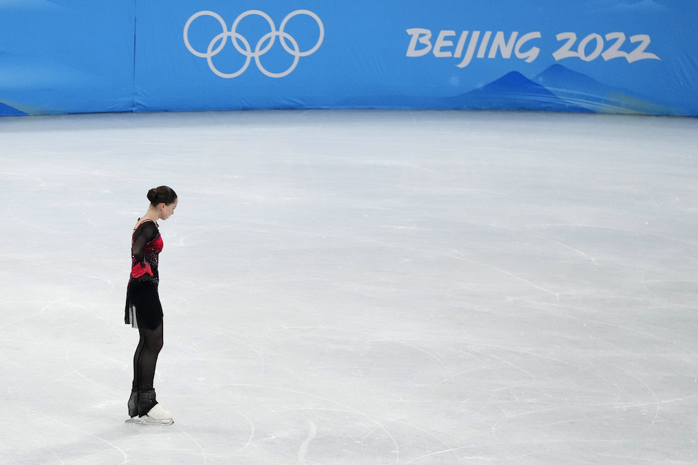 Kamila Valieva dopo la deludente gara nel singolare (AP Photo/Natacha Pisarenko)