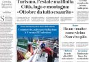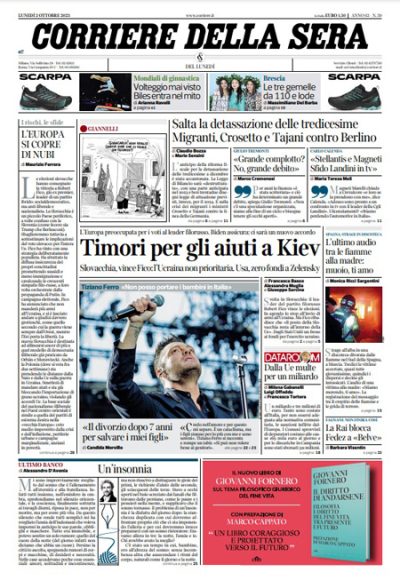 La maggior parte dei giornali di oggi si occupa delle iniziative del governo in campo economico, con le ipotesi sui contenuti della prossima legge di bilancio, le preoccupazioni per le reazioni dei mercati e la crescita dell’inflazione. I giornali di destra rimangono sul tema dell’accoglienza in Italia delle persone migranti, con la polemica con la Germania sul finanziamento delle organizzazioni non governative che operano nel Mediterraneo che oggi vede protagonista il ministro della Difesa Crosetto, il Fatto si occupa delle elezioni in Slovacchia e dell’allargamento del gruppo di paesi contrari a fornire armi all’Ucraina, e Domani apre con un’inchiesta sui costi dell’organizzazione delle Olimpiadi invernali del 2026 a Milano e Cortina.