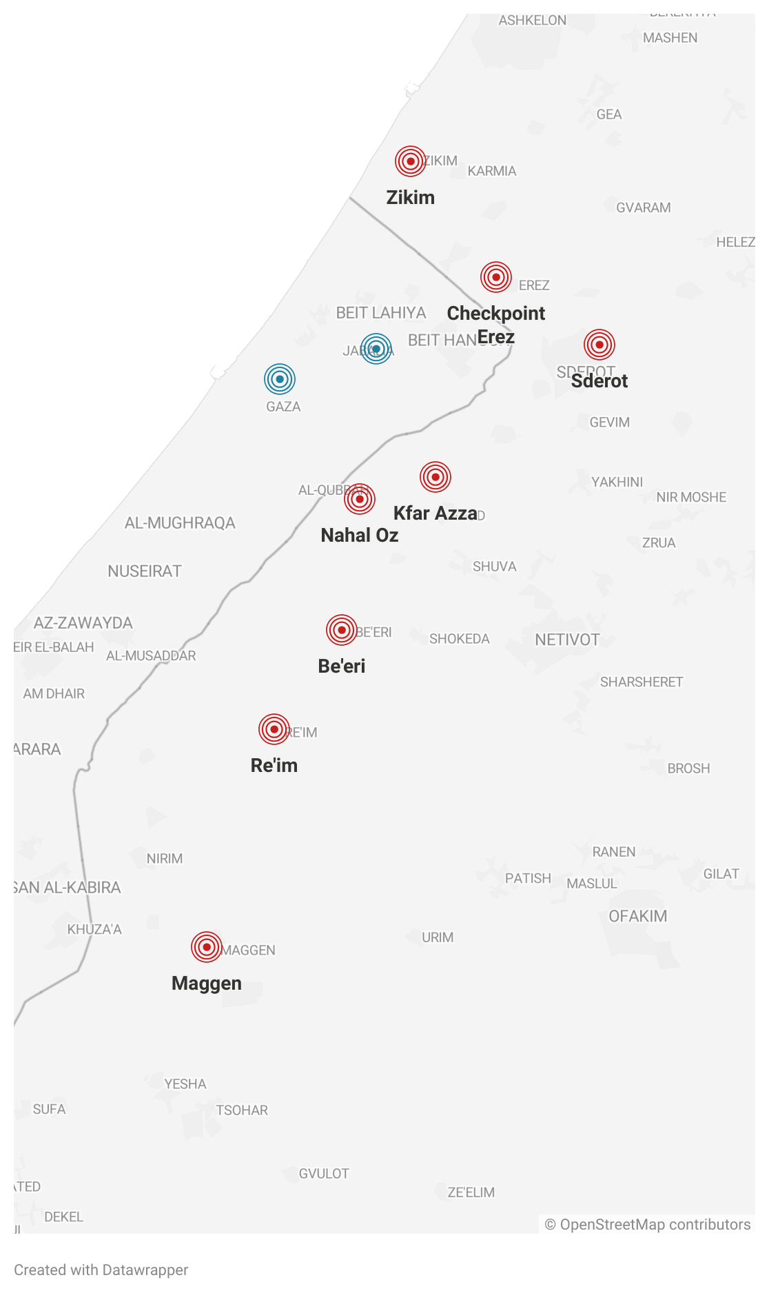 Intorno alle 16 ora italiana (le 17 in Israele) un portavoce dell’esercito israeliano ha fatto sapere che l’esercito israeliano stava combattendo contro i miliziani di Hamas in 22 posti diversi nel sud del paese. Nella mappa qui sotto in rosso sono segnati i principali punti in cui i miliziani palestinesi hanno attaccato civili e militari israeliani. Molte delle cittadine attaccate sono comunità da poche centinaia o migliaia di residenti, in cui l’esercito israeliano fino a sabato mattina aveva una presenza piuttosto limitata.
