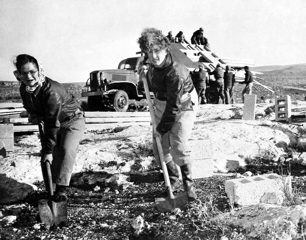 Due donne scavano la terra durante la costruzione del nuovo kibbutz di Yazur, vicino alla città israeliana di Acri, il 20 gennaio del 1949 (AP Photo)