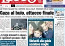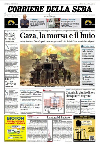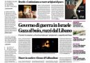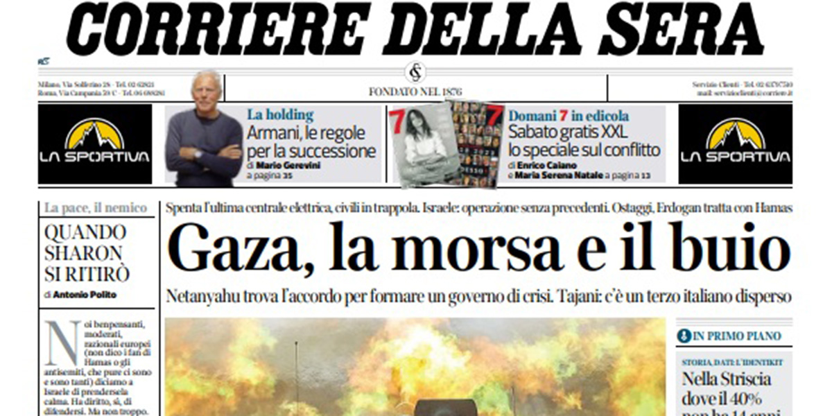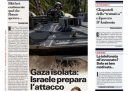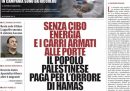 Sono sempre le notizie su Israele e l’assedio della Striscia di Gaza a occupare l’apertura sui giornali di oggi, che titolano sullo spegnimento della centrale elettrica di Gaza, sulle truppe israeliane ammassate al confine con la Striscia in vista di una possibile azione militare via terra, sulle trattative che sarebbero in corso per aprire un passaggio verso l’Egitto per i palestinesi civili in fuga, e sull’accordo raggiunto in Israele per la formazione di un governo di unità nazionale. Fanno eccezione Libero e il Tempo, che aprono invece sulla sentenza della giudice Apostolico a Catania che ha liberato altri quattro migranti che avevano fatto ricorso contro la loro detenzione in un centro di permanenza per i rimpatri.