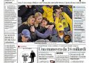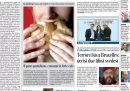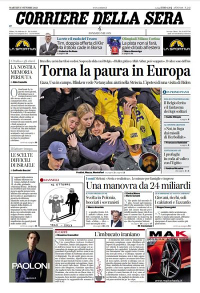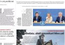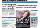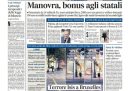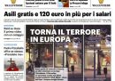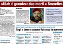 Le notizie principali in apertura sui giornali di oggi sono tre: l’attentato di ieri sera a Bruxelles nel quale un uomo che ha detto di fare parte dell’ISIS ha sparato sulla gente nel centro della città uccidendo due persone, il disegno di legge di bilancio approvato ieri dal Consiglio dei ministri, di cui i giornali illustrano i contenuti più importanti, e l’assedio della Striscia di Gaza da parte di Israele che continua senza ancora che inizi l’invasione via terra annunciata dall’esercito israeliano. I giornali sportivi si occupano dell’indagine sulle scommesse illegali nel calcio e presentano la partita di stasera per le qualificazioni ai prossimi Europei di calcio fra Inghilterra e Italia.