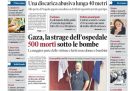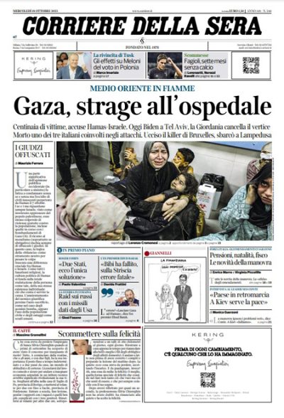 La maggior parte dei giornali di oggi dedica l’apertura al bombardamento dell’ospedale di al Ahli, a Gaza, nel quale sarebbero morte centinaia di persone e per il quale non è ancora chiara la responsabilità, con uno scambio di accuse fra Israele e il gruppo islamista radicale Jihad Islamico, e alla visita a Tel Aviv del presidente degli Stati Uniti Biden, prevista per oggi. Qualche giornale si occupa invece dell’attentato di Bruxelles di lunedì sera e dell’uccisione del responsabile in uno scontro con la polizia belga, ma l’aspetto che interessa più ai giornali italiani è che fosse arrivato a Lampedusa dalla Tunisia nel 2011. I giornali sportivi commentano la sconfitta dell’Italia con l’Inghilterra in una partita di qualificazione agli Europei di calcio del 2024 e seguono le notizie sulle scommesse illegali nel calcio.
